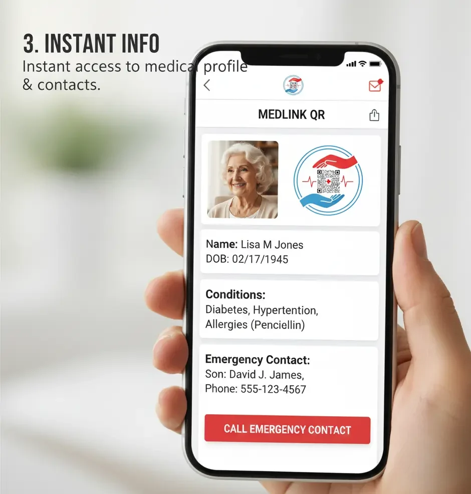 My husband has a complex medical history, and carrying pages of records isn't practical. After an unexpected event, the EMTs scanned his MEDLINK QR card immediately. They got the essential facts about his medication and condition in seconds, which truly expedited his care. This technology is a game-changer for emergency response.
